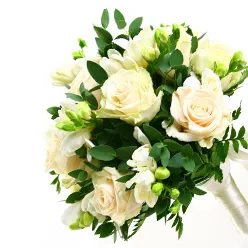 • Классический круглый букет из белых роз или нежных диантусов;