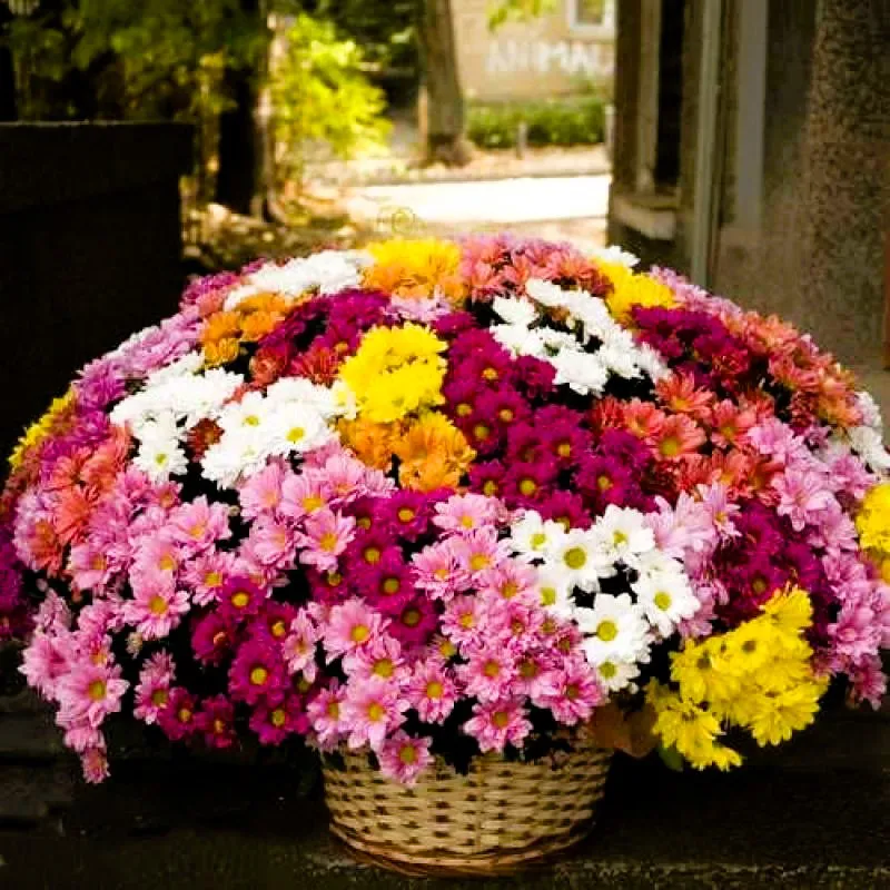 Каждая корзина с хризантемами может быть индивидуально оформлена, что добавляет особый шарм и уникальность. Вы можете выбрать сочетание розовых, желтых, белых, красных и оранжевых хризантем, создавая идеальный акцент для любого случая.