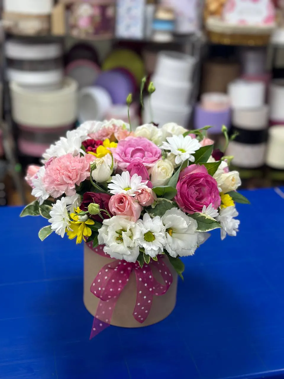 Вдохновляющий букет, располагающийся в стильной шляпной коробке, словно полное чудес волшебство природы. Каждый цветок в этом изысканном ансамбле — это отдельная история, гармонично переплетающаяся с другими. Яркие розы, нежные эустомы, лёгкие гвоздики и утонченные хризантемы создают симфонию форм и оттенков.