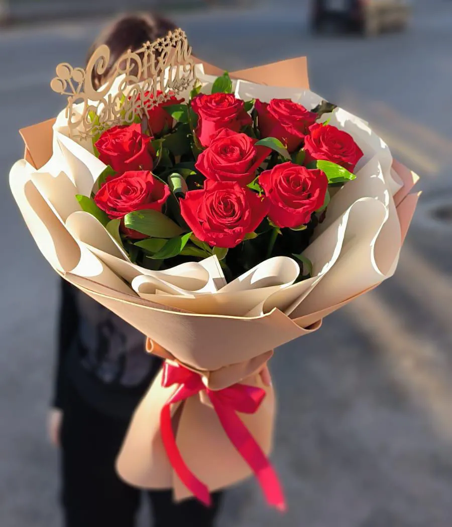 Состав букета: красные розы, зелень, топпер ,упаковка, лента