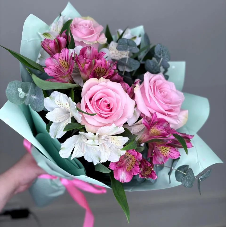 Представьте себе гармонию, где нежность роз встречается с утонченной элегантностью альстромерий. Этот потрясающий букет – настоящее произведение искусства, созданное природой для самых особенных моментов.