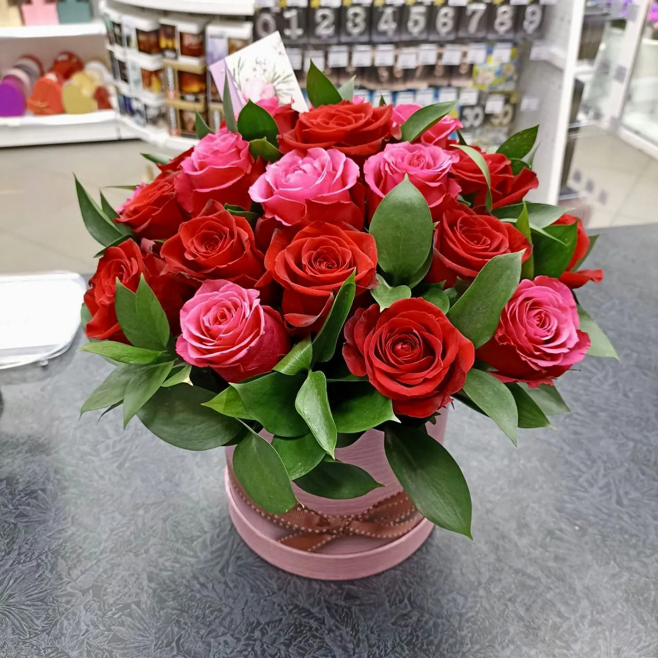 Вариант—Стандарт - роза - 11 шт.,зелень, оазис, шляпная коробка