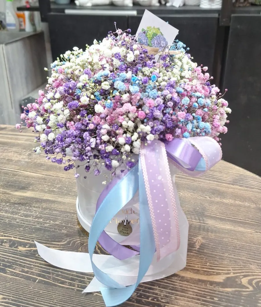Великолепный букет из разноцветной гипсофилы в стильной шляпной коробке — это настоящее произведение флористического искусства. Легкие и воздушные цветочки гипсофилы, словно облака, нежно смешиваются между собой, создавая игривую палитру оттенков: белого, нежно-розового, голубого и мятного. Каждая веточка добавляет легкость и романтику, наполняя пространство свежестью и атмосферой праздника.