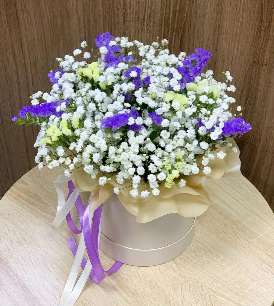 Шляпная коробка с гипсофилой и статицей — это великолепное сочетание нежности и утончённой красоты. Гипсофила, с её облачками мелких белых цветочков, придаёт композиции невесомость и романтичность, как будто в ней заключены лёгкие облака. Статица, со своими яркими и насыщенными оттенками, добавляет динамики и игривости, создавая прекрасный контраст с лёгкостью гипсофилы.