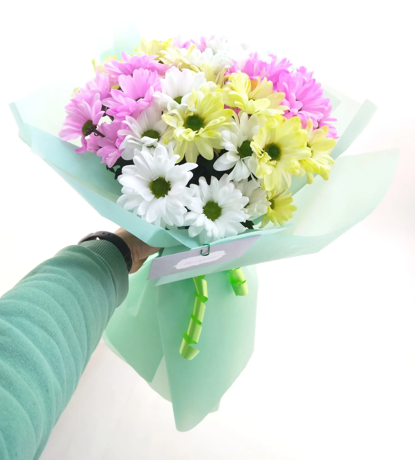 Разноцветные хризантемы, упаковка,лента
