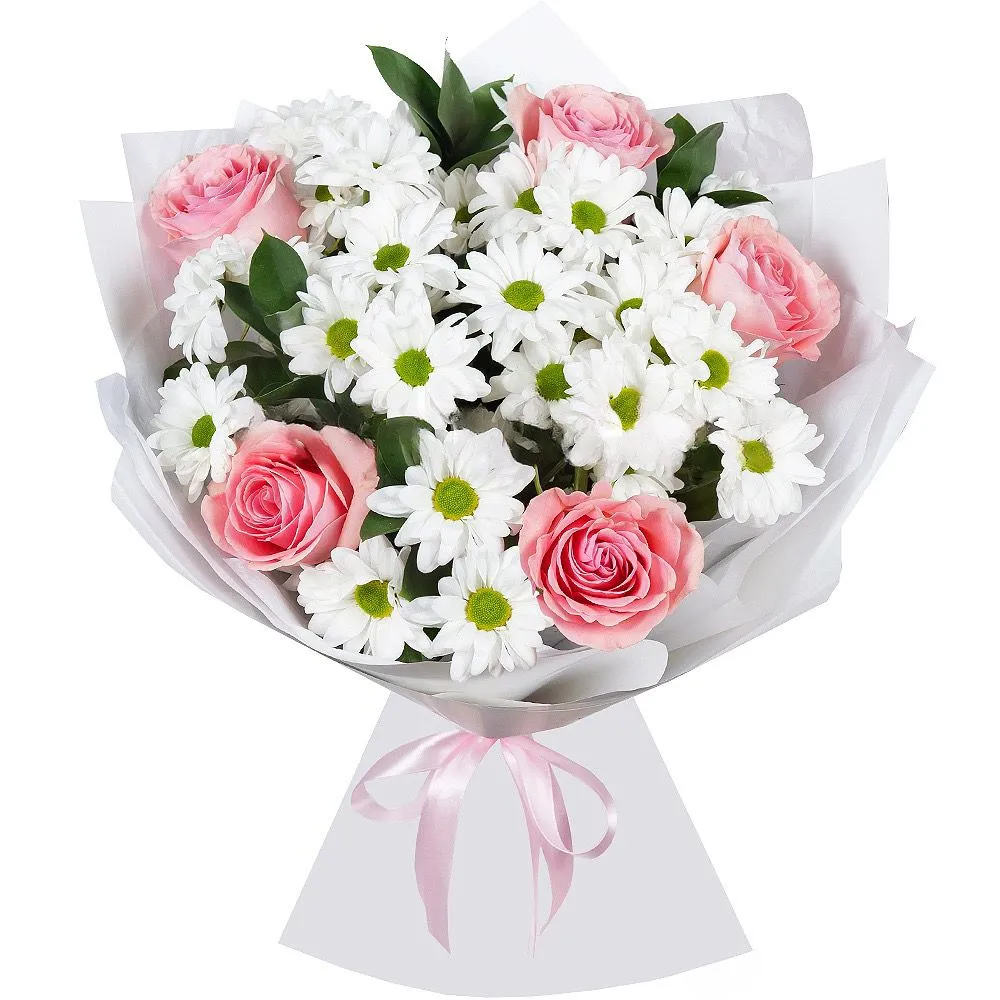 • Средний (Кустовая хризантема 5 шт,, роза 7 шт, зелень, упаковка, лента)