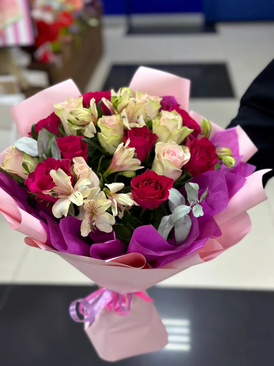 Позвольте себе утонуть в нежной симфонии красок и ароматов, которую дарит этот восхитительный букет. Здесь, словно в волшебном танце, переплетаются величественные розы, символизирующие любовь и страсть, и изящные альстромерии, олицетворяющие дружбу, заботу и благополучие.
