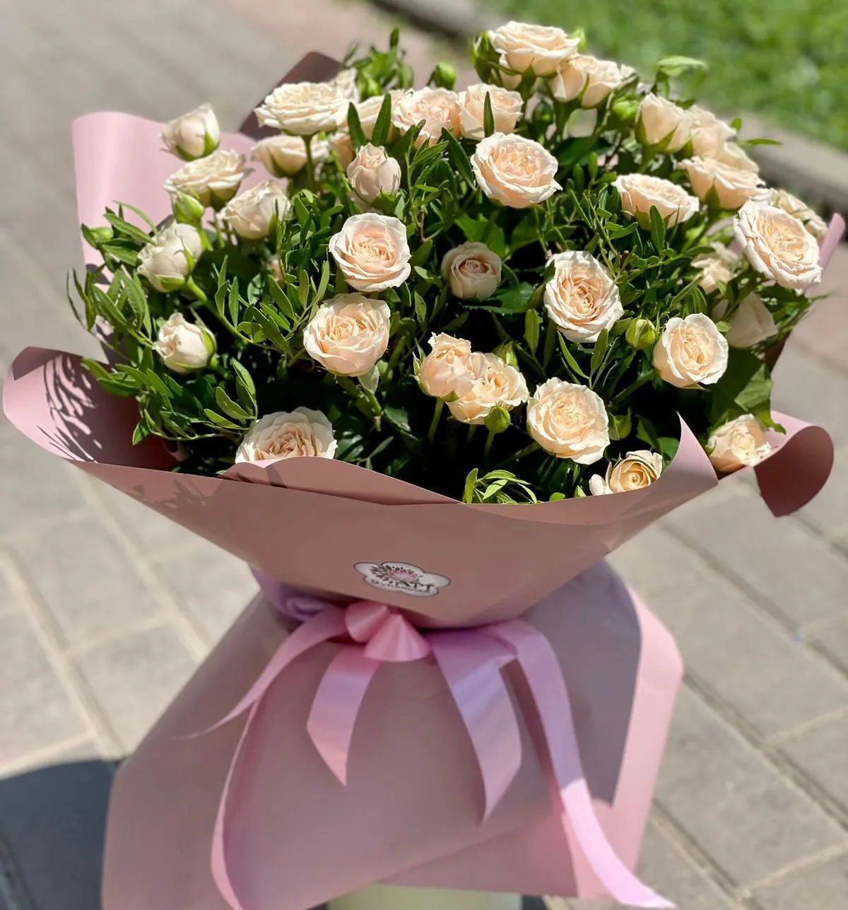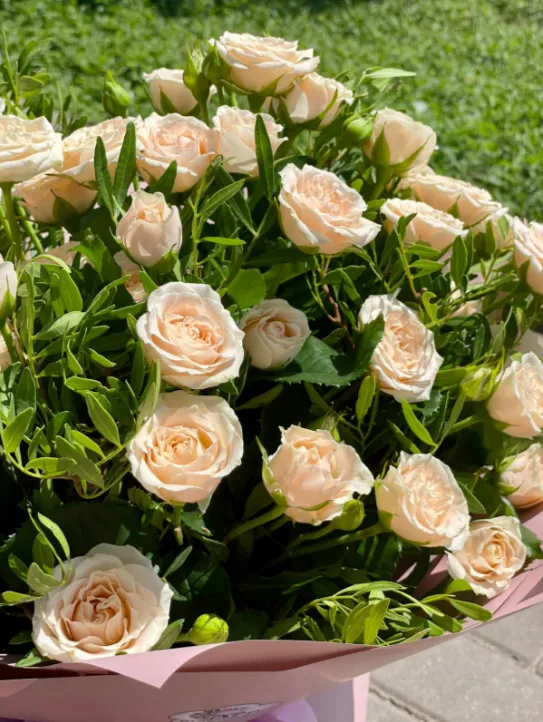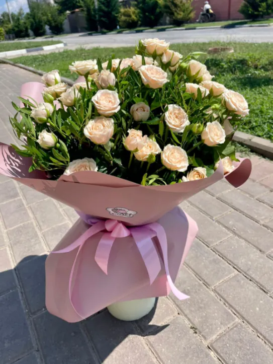 • Средний - кустовая роза - 7 шт., зелень, упаковка, лента