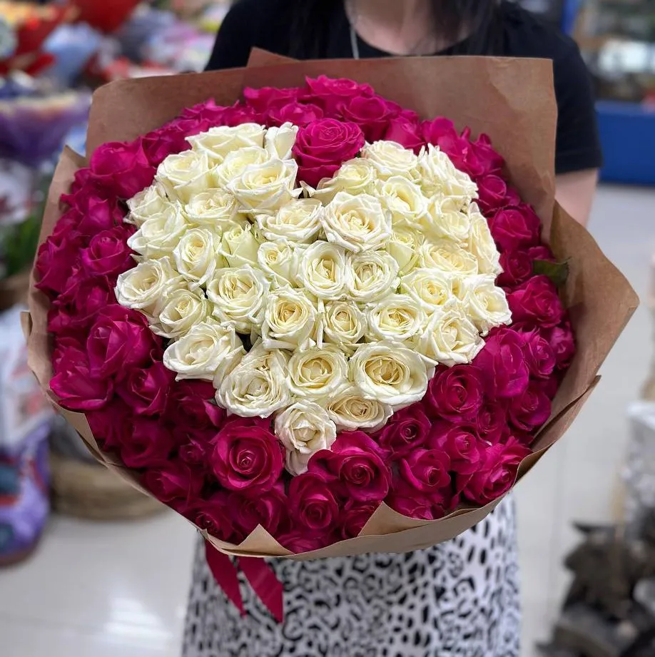 Этот великолепный букет из 101 белой и розовой розы в форме сердца – идеальное воплощение любви и нежности. Каждая роза, нежная и свежая, будто пропитана теплом чувств и искренностью намерений. Белые розы, символизирующие чистоту и уважение, изящно соседствуют с розовыми, олицетворяющими нежность и романтику.