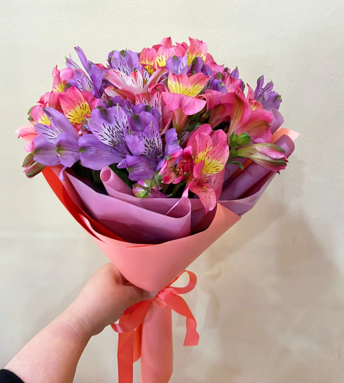 Состав букета: альстромерия микс, упаковка.лента